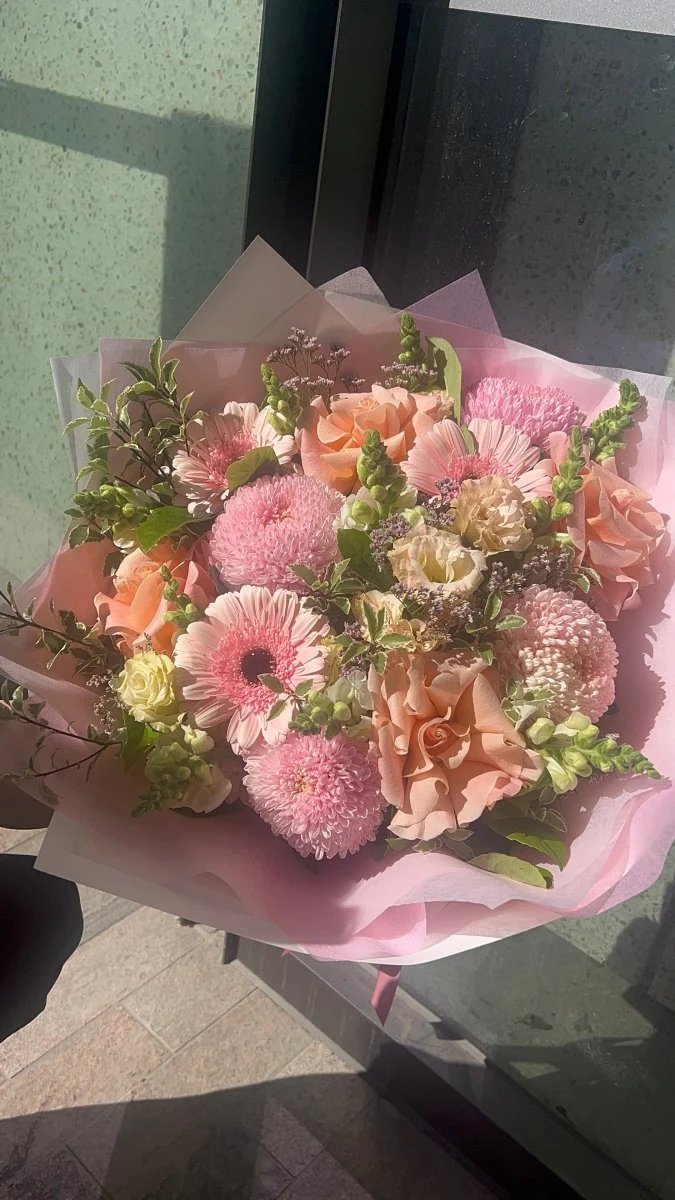 Strawberry Mousse, a perfect combination of sweet colours! This delightful arrangement of seasonal blooms in shades of pinks and peach is sure to bring a smile to the face of any flower lover.